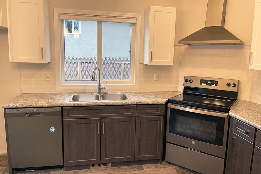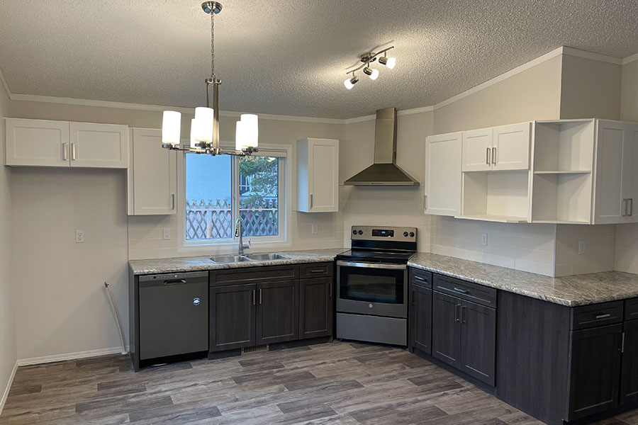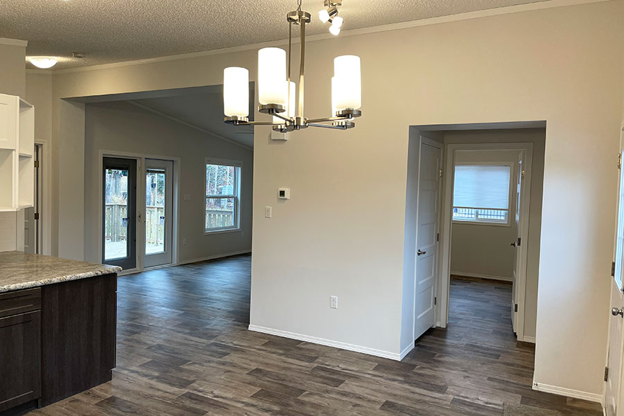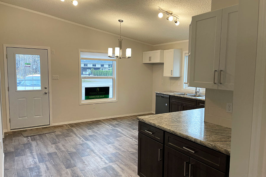 - Combined kitchen and dining area with L-shaped kitchen and optional glass door display cabinets